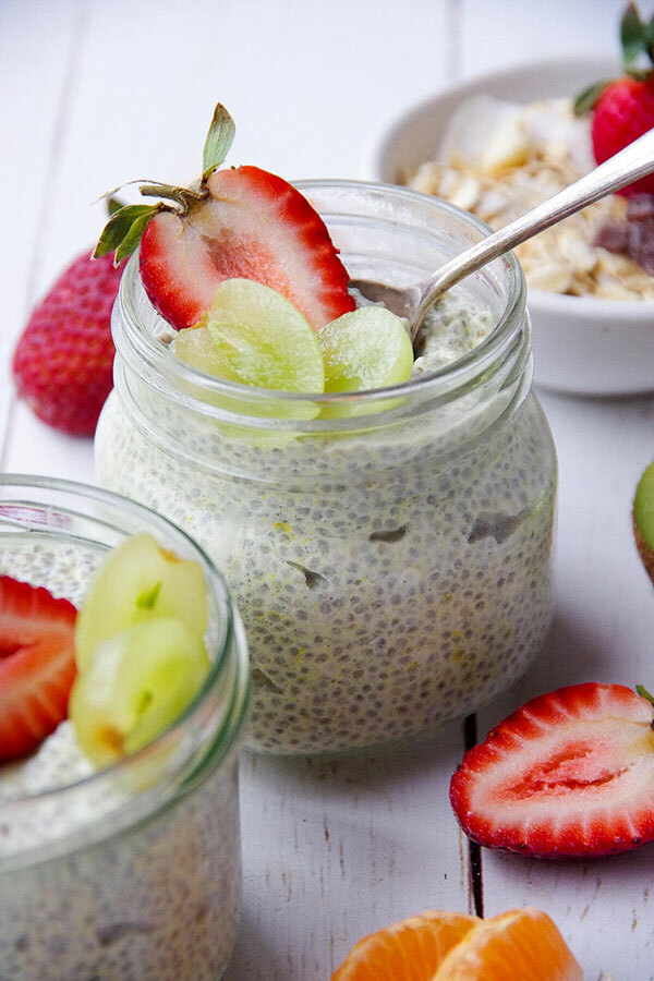- Spoon chia pudding into two small glass jars or glasses and leave in the fridge overnight.